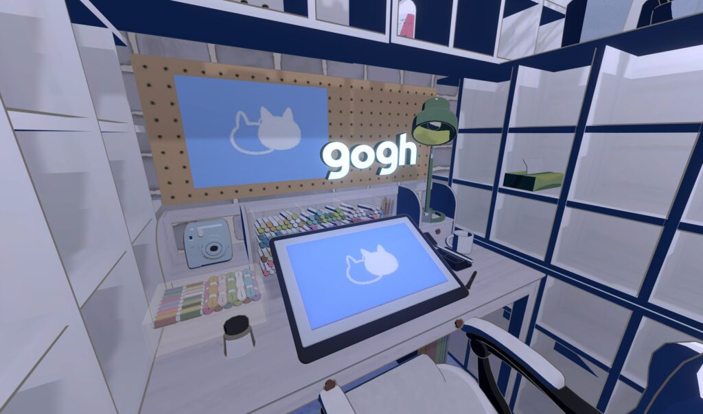 今回はお部屋のインテリアをブルー中心にしたかったので、PCやポスターなどのデザインに、自分でねこちゃんマークを作成して貼り付けてみました。